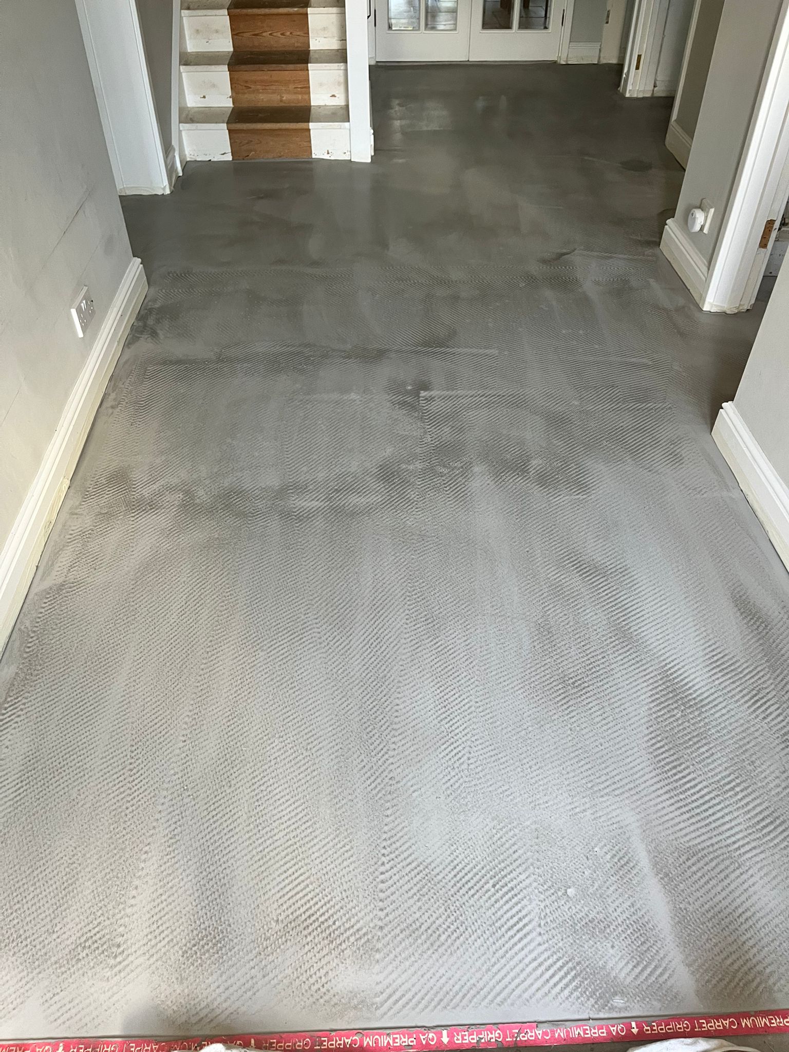 Prep work from the Amtico job above. Old click LVT and parquet flooring underneath was uplifted and disposed of, which left a height difference of 22mm and a damp floor. To overcome this we used x3 coats of moisture tolerant latex screed and a liquid DPM. This left the floor the correct height with the original skirting so as to not leave a gap and a smooth, dry floor to lay the Amtico on